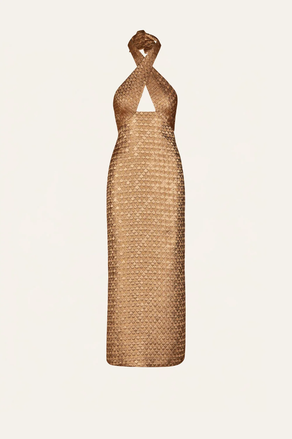 A halter dress in golden Lurex jacquard. Defined by a twisted neckline, front cutout, and open back. High-shine texture makes it ideal for evening. Wear on its own or layer under a sharp blazer. Size and Fit: True to size. Designed for a slim fit. Please refer to our size chart for detailed guidance. Product Details: Closure: Back Zipper Composition: 45% Acrylic, 41% Cellulose Acetate, 14% Polyester Fabrication: Lurex Jacquard Color: Gold Made in Colombia Dimensions: Length 36.22''