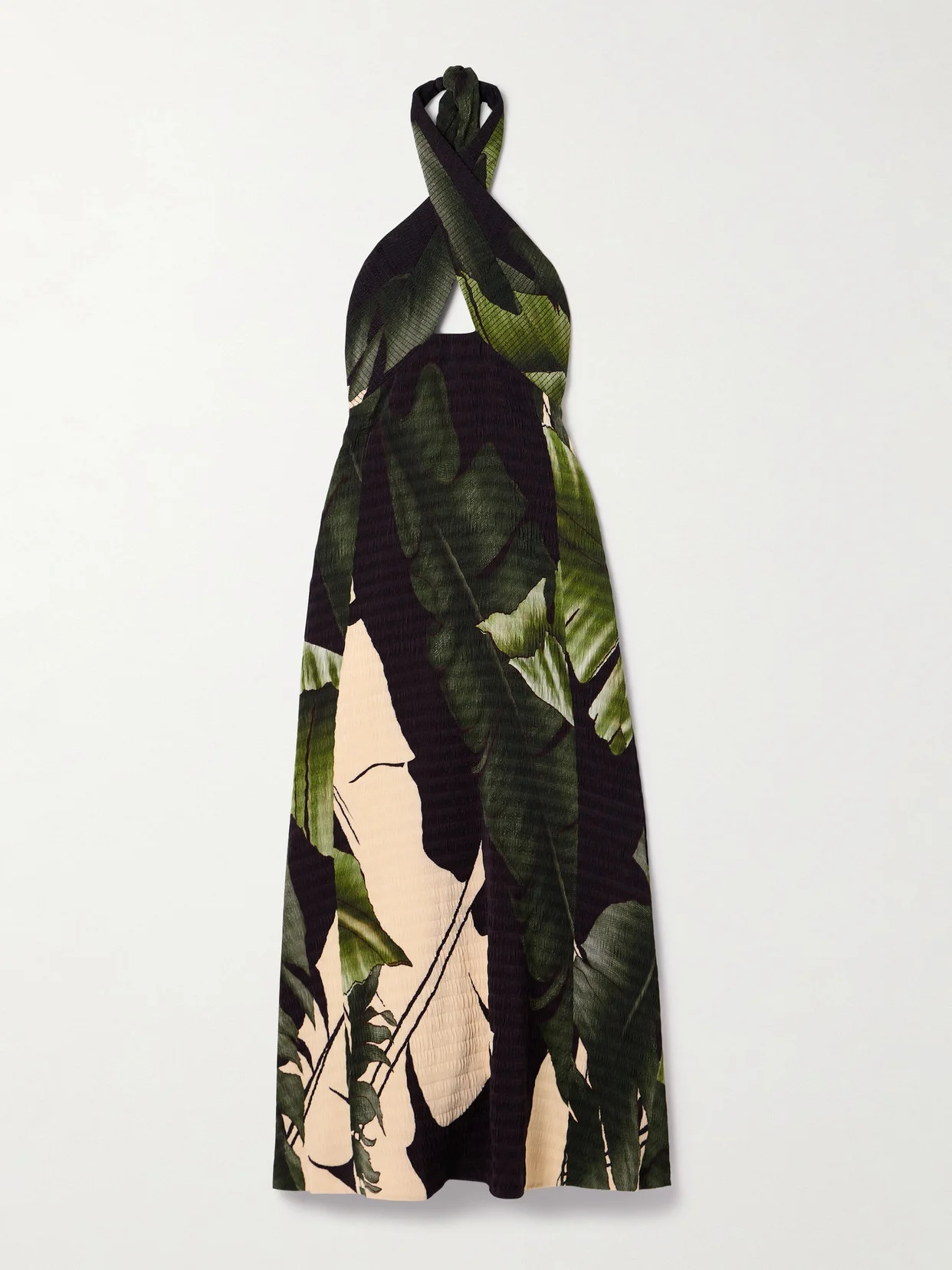 Johanna Ortiz's ‘Elegant Expedition' midi dress is made from tactile plisse-satin printed with a mix of artistic and lifelike botanical motifs. It's designed with sweeping halterneck ties that crossover at the bust and create a small cutout. Wear yours with strappy sandals and a statement bag.