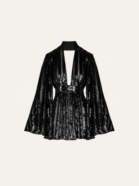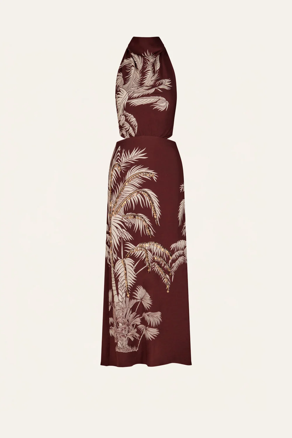 A halter dress in heavy crepe with a tropical placement print. Defined by clean lines and a column cut. Wear on its own with bold jewelry for warm days, or layer under a jacket for evening. Size and Fit: True to size. Designed for a slim fit. Please refer to our size chart for detailed guidance. Product Details: Closure: Back Zipper Composition: 95% Viscose, 5% Elastane Fabrication: Heavy Crepe Color: Chocolate/Ecru Made in Colombia Dimensions: Length 36.22''