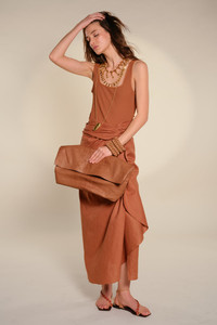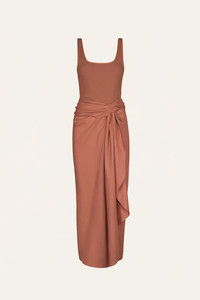 This asymmetric ankle-length dress features a crinkle lycra top and linen skirt, joined by a knotted drape detail. Its natural texture and warm tone create a grounded, confident look. Style it with bold jewelry and flat sandals for a relaxed yet elevated outfit. Size and Fit: - True to size. - Please refer to our size chart for detailed guidance. Product Details: Closure: Back Zipper Composition: 80% Linen, 17.5% Recycled Polyamide, 2.5% Elastane Fabrication: Crinkle Lycra/Linen Color: Camel Made in Colombia Dimensions: Length 37.4''