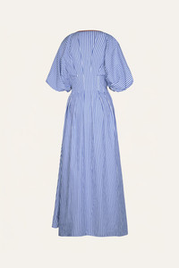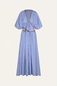 Cotton midi dress with a plunging neckline, wide short sleeves, and a knotted front. Cut in a relaxed silhouette and detailed with crisp vertical stripes in ecru and blue for a fresh, seasonal feel. Size and Fit: - True to size. - Boxy fit. - Please refer to our size chart for detailed guidance. Product Details: Closure: Front Buttons Composition: 100% Cotton Fabrication: Cotton Color: Off White/Blue Made in Colombia Dimensions: Length 36.22''