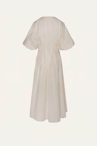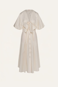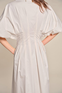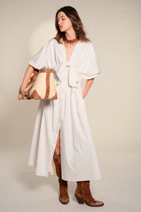 Cotton midi dress with wide short sleeves, a plunging neckline, and an oversized front tie. The relaxed silhouette is finished with side pockets, a button-down front, and a gently flared hem for ease and movement. Size and Fit: - True to size. - Boxy fit. - Please refer to our size chart for detailed guidance. Product Details: Closure: Front Buttons Composition: 97% Cotton, 3% Elastane Fabrication: Cotton Poplin Color: Ecru Made in Colombia Dimensions: Length 36.22''