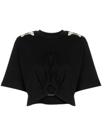 Ensenada embroidered cropped T-shirt Embracing Johanna Ortiz's artisanal aesthetic, this Ensenada T-shirt is stitched with eclectic embroidery at the shoulders that speaks to the designer’s Colombian roots. It’s cut from stretch cotton with a gathered O ring at the front that draws the eye to the cropped hem. Highlights - Black - Stretch-cotton - Embroidered design - Ring embellishment - Cut-out detailing - Crew neck - Short sleeves - Asymmetric hem - Cropped Imported Composition Cotton 96%, Elastane 4% SIZE & FIT Model measurements Height 5 ft 11 in(1.8 m) Bust/Chest 34.25 in(87 cm) Hips 35.82 in(91 cm) Waist 24.8 in(63 cm) FittingInformation Designed for a slim fit that sits just away from the body offering a close yet comfortable fit The internal shoulder pads offer a structured shape Made from a midweight stretch fabric, this piece offers elasticity and flexibility when worn This piece fits true to size – take your usual size Washing instructions Dry Clean Only