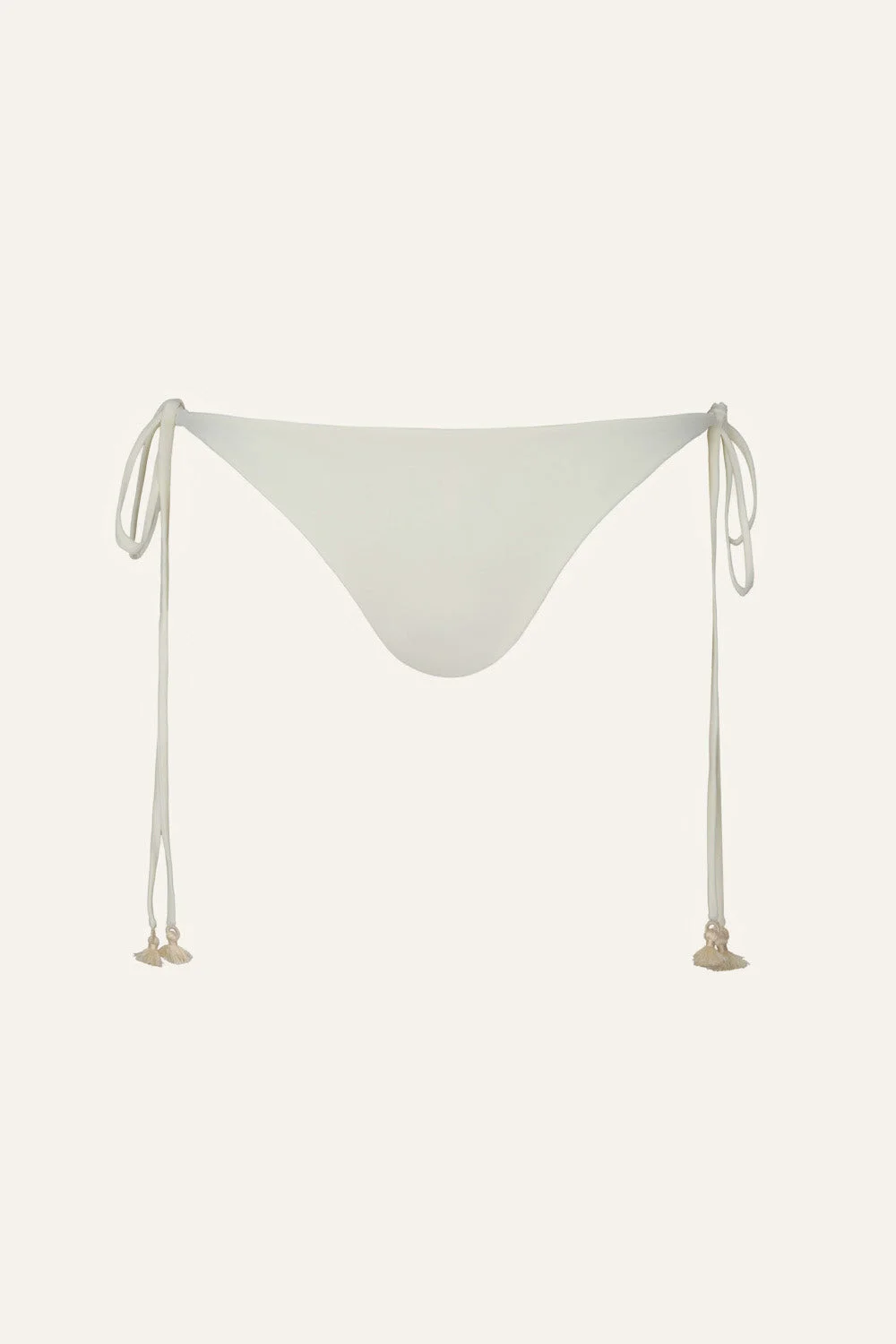 Tie-side bikini bottoms in ecru with delicate tassel detailing at the ends. These adjustable bottoms offer a versatile fit and can be effortlessly paired with matching or contrasting bikini tops for a beach-ready look. Size and Fit: Designed for a slim fit. Please refer to our size chart for detailed measurements and guidance. Product Details: Closure: Tie On Side Composition: 80% Polyamide, 20% Elastane Fabrication: Lycra Color: Ecru Made in Colombia