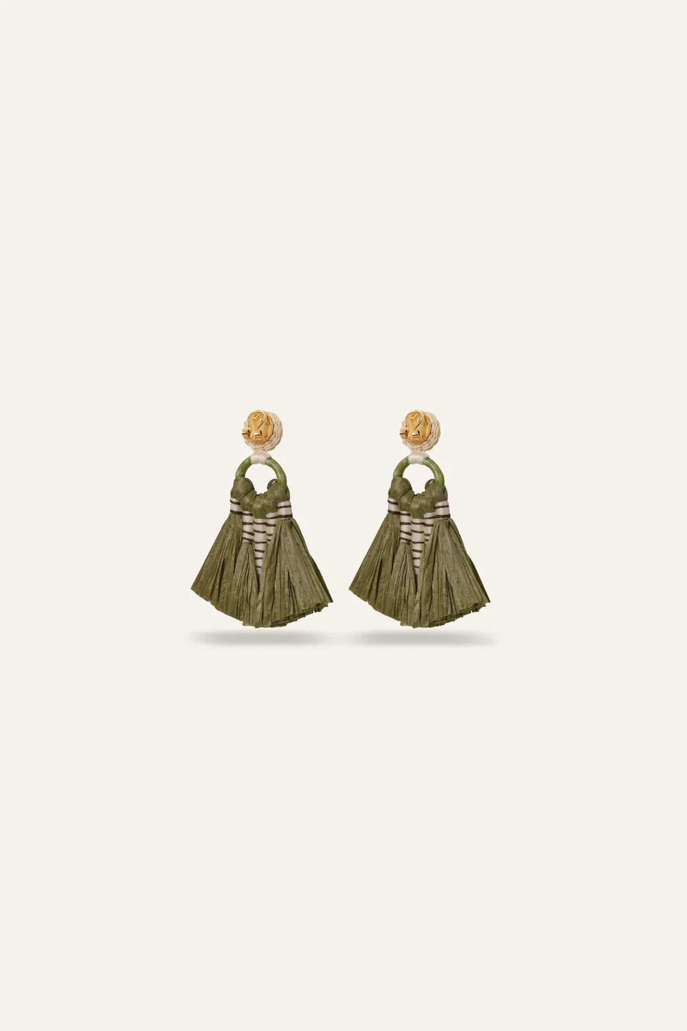 Artisanal statement earrings crafted from a blend of materials and the iconic Iraca palm. Intricately woven details and bold tassels create a striking balance of texture and movement, adding an effortless touch of sophistication to any look. Product Details: Closure: Post Fastening With Omega Clip Composition: 80% Viscose, 10% Cotton, 10% Natural Fiber - Iraca Palm Fabrication: Viscose & Cotton Earrings Color: Maguey Green/Ecru/Chocolate Made in Colombia Dimensions: Height 4.1'', Width 1.4''