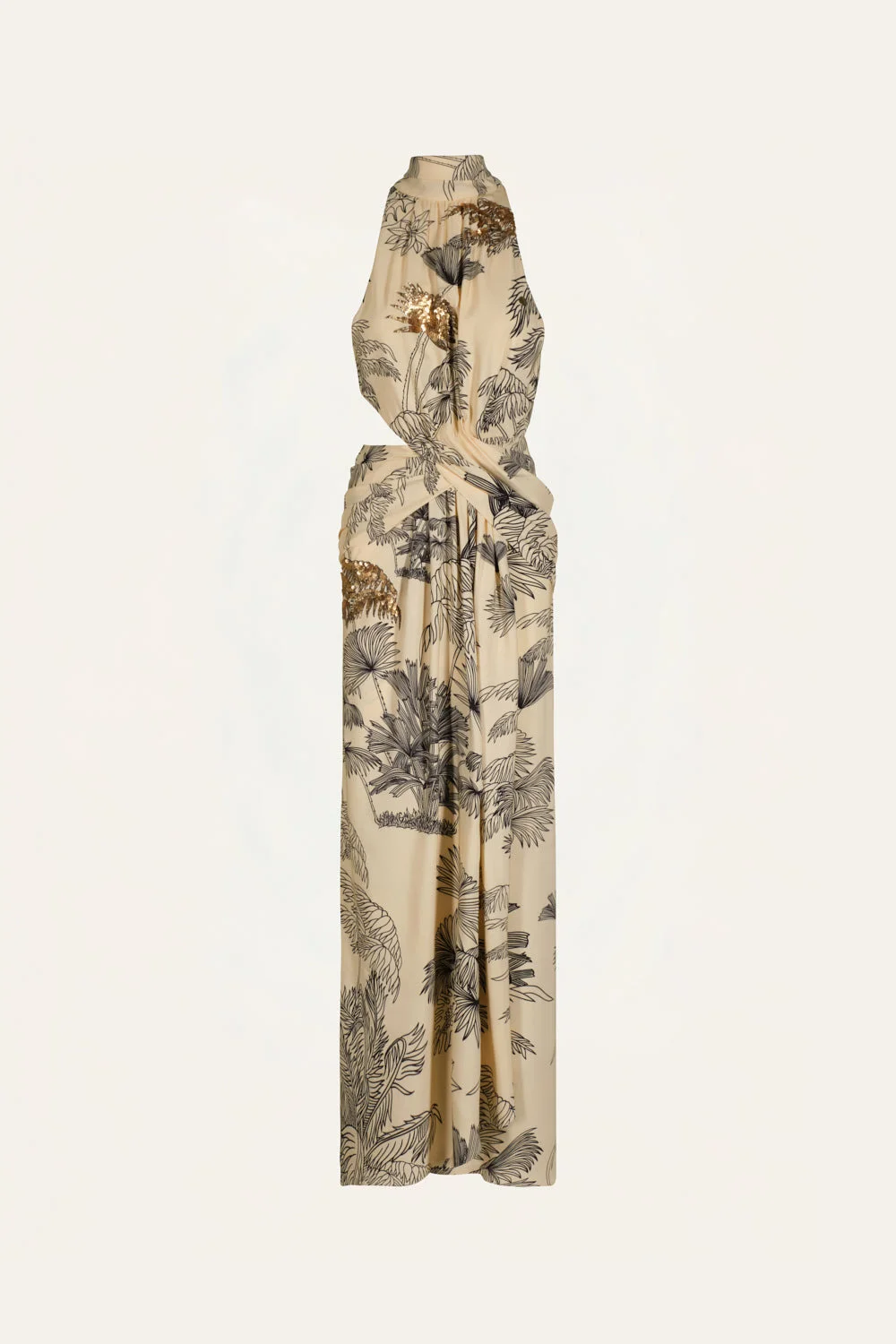 Maxi dress in heavy crepe featuring a tropical print. Designed with a high neckline, sleeveless cut, and gathered detailing at the waist. A timeless piece for daytime events or elegant evening occasions. Size and Fit: True to size. Maxi length. Please refer to our size chart for detailed guidance. Product Details: Closure: Back Buttons And Back Zipper Composition: 95% Viscose, 5% Elastane Fabrication: Heavy Crepe Color: Ecru/Black/Gold Made in Colombia Dimensions: Length 44.09''