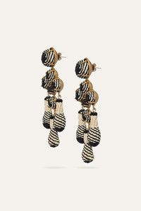 Statement earrings inspired by the rhythm and passion of flamenco. Featuring intricate woven details and cascading tassels, they bring movement and elegance to any look, effortlessly complementing both evening wear and elevated daytime ensembles. Product Details: Closure: Post Fastening Composition: 90% Natural Fiber (Iraca Palm), 10% Copper Alloys Fabrication: Natural Fiber (Iraca Palm) Earring Color: Ecru/Midnight Black/Gold Made in Colombia