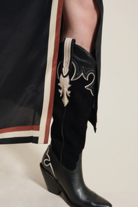 Rooted in classic Western influences, these knee-high boots make a bold impression through their high-contrast embroidery and sculpted heel. A pointed toe and curved shaft add attitude, while the tonal black base keeps them grounded—style them with long dresses or layered skirts to let the silhouette shine. Product Details: Closure: Slide On Composition: 100% Cow Leather, Heel: Wood Fabrication: Leather Boots Royal Color: Black/Sand Made in Colombia Dimensions: Heel Height 2.76''