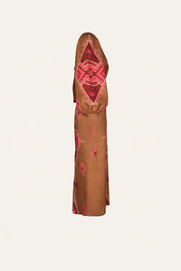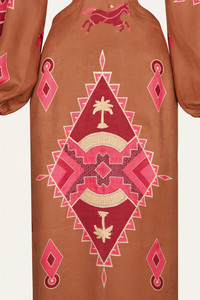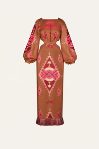 Linen maxi dress with long sleeves and side cutouts, featuring a striking geometric motif and a full raffia base that adds texture, movement, and a JO touch. Size and Fit: - True to size. - Please refer to our size chart for detailed guidance. Product Details: Closure: Back Zipper Composition: 100% Linen & Viscose Fabrication: Linen Color: Camel/Wine/Pink Made in Colombia Dimensions: Length 37.4''