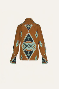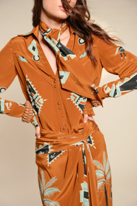 Silk shirt with a fluid drape, featuring a coordinating scarf that can be tied at the neck or styled loosely. The Western-inspired print adds rhythm and character to the silhouette, while the button-front and tailored cuffs bring structure. Pair it with the matching wrap skirt or contrast it with soft neutrals for a versatile daytime ensemble. Size and Fit: - True to size. - Please refer to our size chart for detailed guidance. Product Details: Closure: Front Buttons Composition: 100% Silk Fabrication: Silk Cdc Color: Rust/Green/Mint Made in Colombia