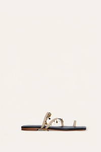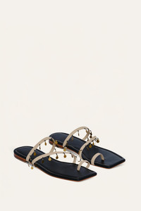 Delicate leather sandals designed with slender straps, adorned with metallic charms that move gracefully with each step. The minimalist silhouette brings an elevated touch to warm-weather dressing, perfect for both daytime ease and evening refinement. Product Details: Hand Embroidered Closure: Slide On Composition: Upper: 100% Cow Leather, Outer Sole: 100% Cow Leather Fabrication: Leather Sandals Color: Ecru/Black Made in Colombia Dimensions: Heel Height 0.28''