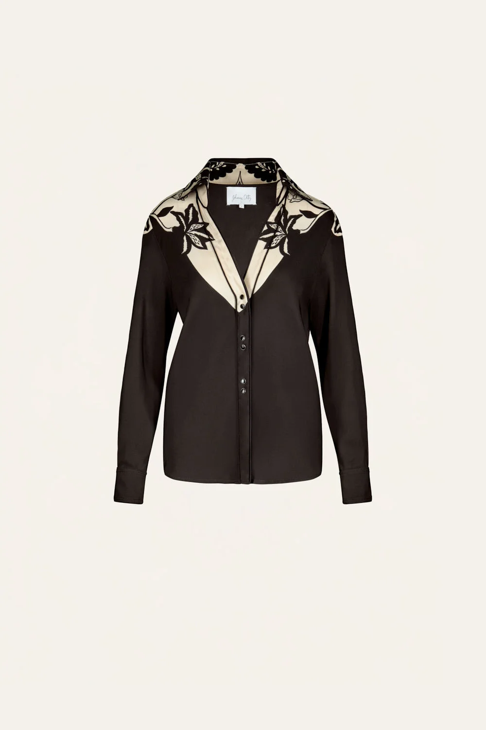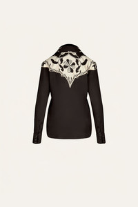 A tailored shirt in heavy crepe featuring contrast detailing at the collar and shoulders. Its clean lines and soft drape make it easy to wear tucked into high-waisted skirts or trousers. Pair it with the matching wrap skirt for a coordinated look, or dress it down with denim. Size and Fit: True to size. Designed for a relaxed fit. Please refer to our size chart for detailed guidance. Product Details: Closure: Front Buttons Composition: 95% Viscose, 5% Elastane Fabrication: Silk Cdc Color: Black/Ecru Made in Colombia