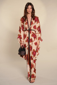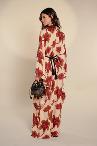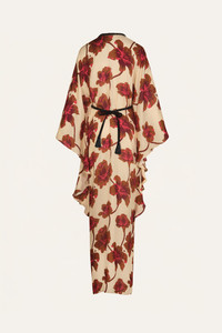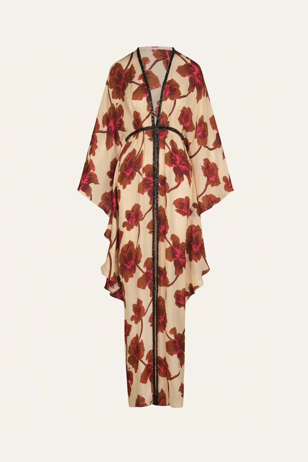 Flowing silk tunic dress with a deep neckline, embroidered trim, and soft high-low hem. The placement floral print is framed by tonal beading that traces the front and defines the waist. With its dramatic sleeves and fluid silhouette, this piece is designed to make a statement, bold yet refined. Size and Fit: - True to size. - Please refer to our size chart for detailed guidance. Product Details: Closure: Tie At Back Composition: 100% Silk Fabrication: Silk Cdc Color: Ecru/Camel/Wine/Pink Made in Colombia Dimensions: Length 44.09''