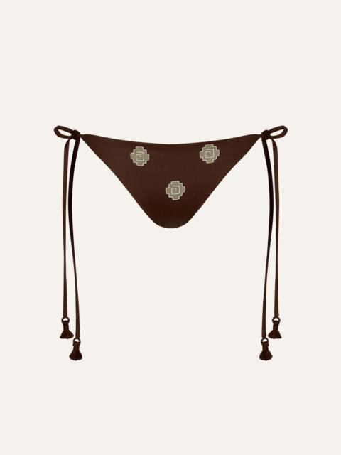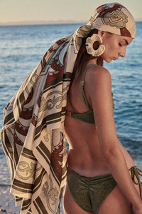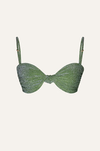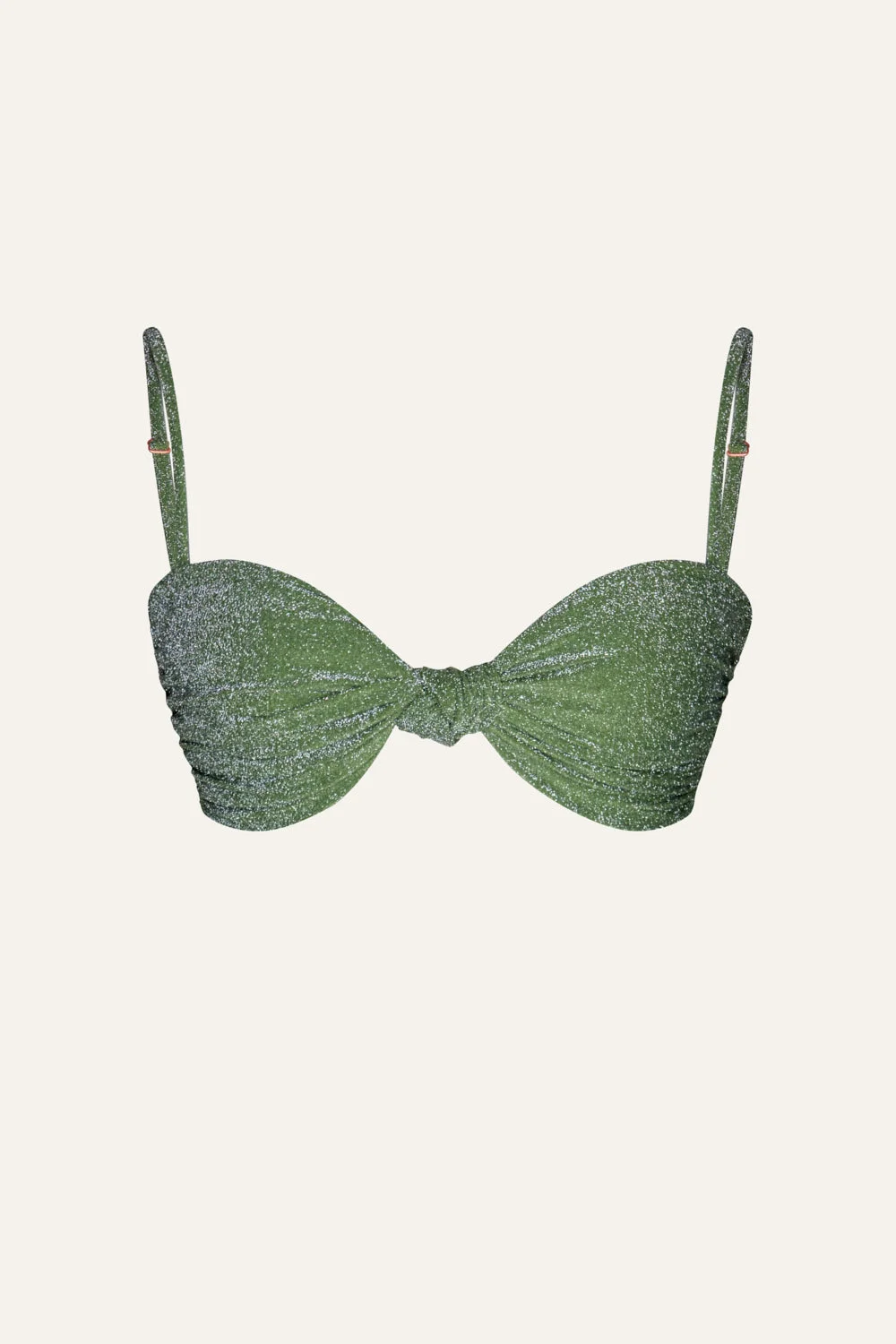 A refined take on swimwear, this shimmering Lycra bikini top features a heart-shaped neckline, twisted front detail, and adjustable straps. The metallic sheen adds a touch of radiance, perfect for elevating beachside looks. Size and Fit: - True to size. - Adjustable shoulder straps. - Please refer to our size chart for detailed guidance. Product Details: Closure: Tie Fastening Composition: 66% Recycled Polyamide, 26% Metallic Silver, 8% Elastane Fabrication: Shimmering Lycra Color: Maguey Green Made in Colombia