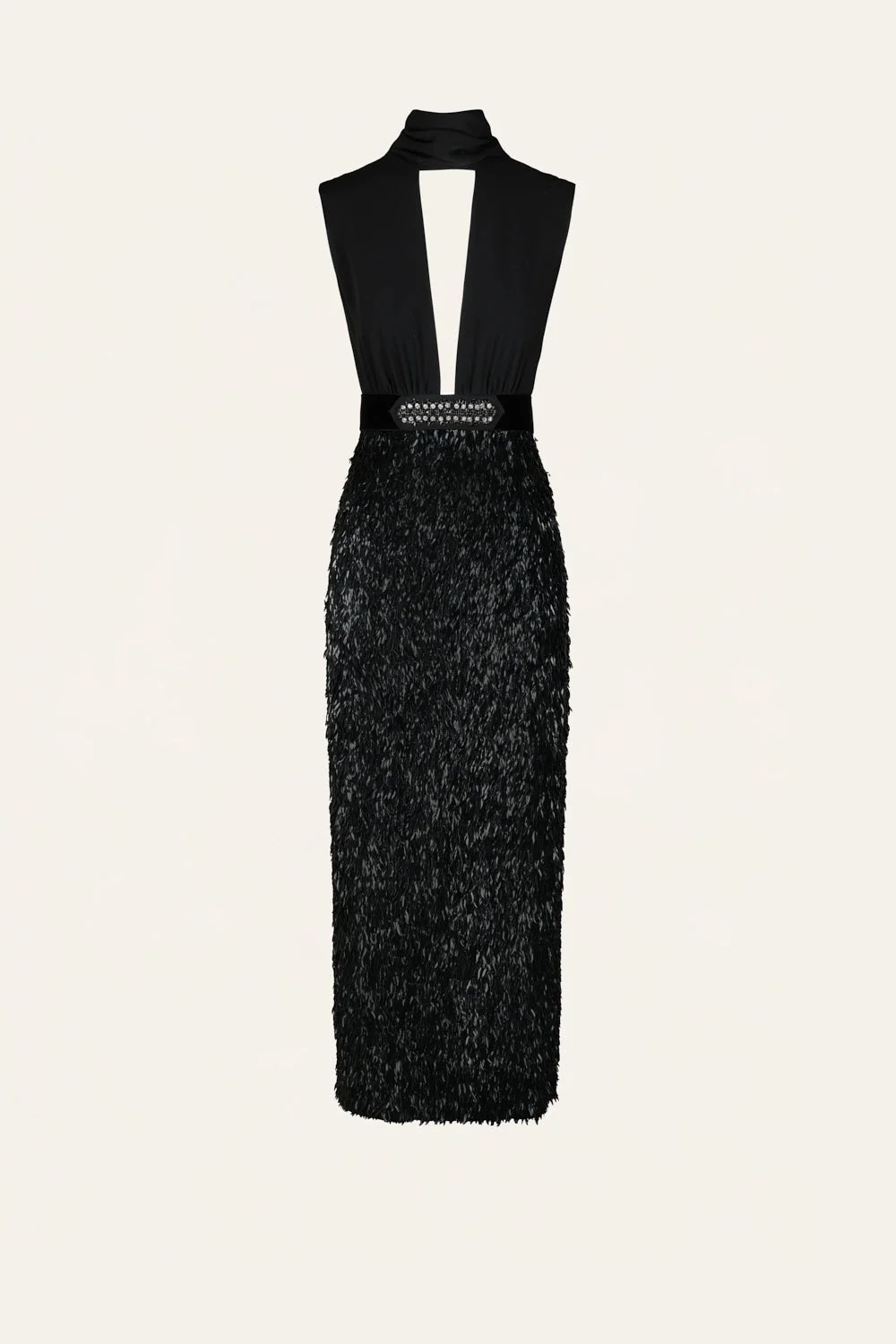 This sleeveless sequin dress features a plunging neckline and a sculpted waistband. Designed to catch the light, it offers a polished option for evening. Complete the look with a clutch and heels. Size and Fit: True to size. Designed for a slim fit. Please refer to our size chart for detailed guidance. Product Details: Closure: Back Zipper Composition: 100% Polyester Fabrication: Sequins Color: Black Made in India Dimensions: Length 36.22''