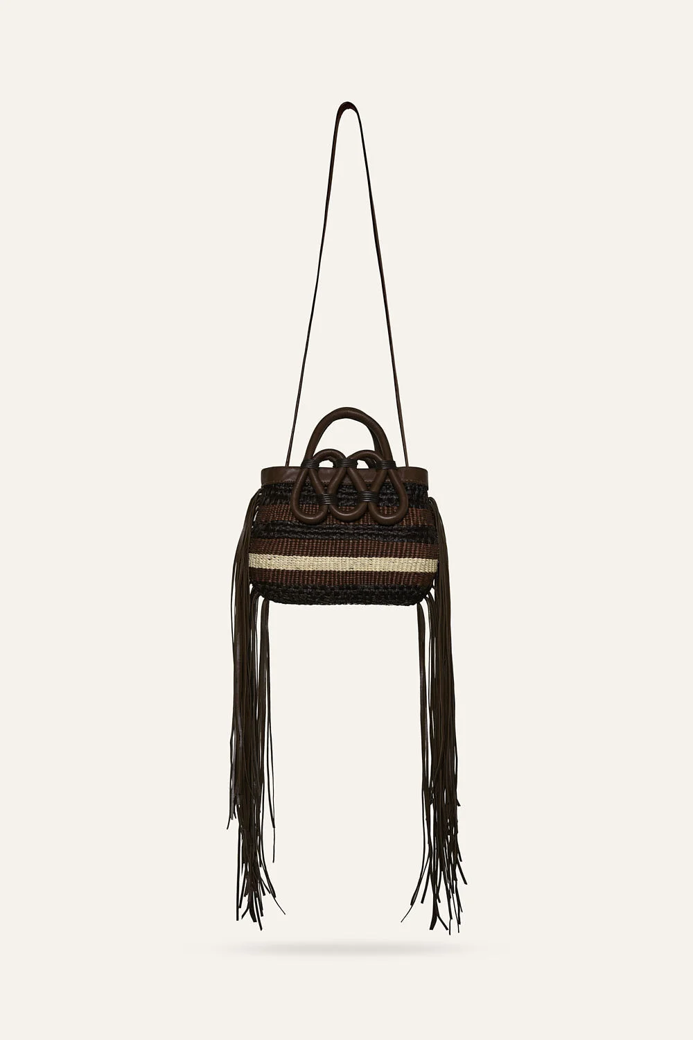 A distinctive mini tote crafted from Iraca palm, combining rich textures with intricate details. Featuring structured handles and fringe accents, it highlights the beauty of traditional craftsmanship while offering a refined, versatile design for day-to-night styling. Product Details: Closure: Open Top Composition: 85% Natural Fiber (Iraca Palm), 15% Cow Leather Fabrication: Natural Fiber (Iraca Palm) Leather Tote Bag Color: Dark Chocolate/Midnight Black/Ecru Made in Colombia
