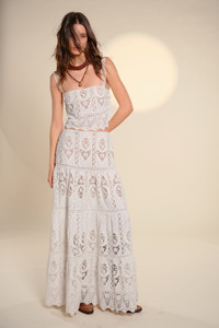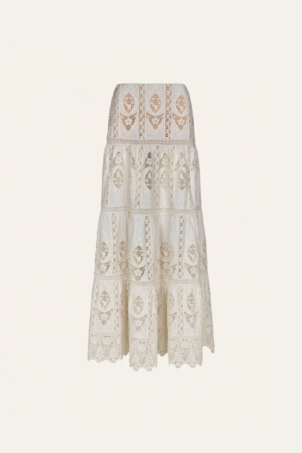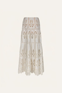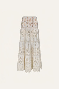 Tiered maxi skirt crafted in embroidered voile, designed with paneled construction and intricate cutwork that adds texture and movement. The full-length silhouette sits high at the waist and flows with ease. Wear it with the matching top for a striking set or pair it with a monochrome top to create contrast. Size and Fit: - Runs big based on customer feedback; consider sizing up for the best fit. - Flowy silhouette. - High-rise. - Please refer to our size chart for detailed guidance. Product Details: Closure: Back Zipper Composition: 100% Polyester Fabrication: Embroidered Voile Color: Ecru Made in Colombia Dimensions: Length 44.09''