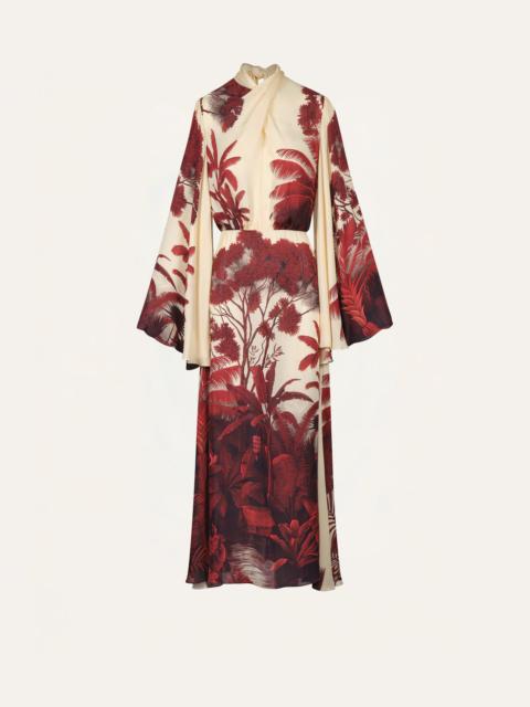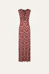 A reversible dress crafted in shiny jersey with a fluid drape and an animal-inspired dot print. Featuring a classic JO silhouette with a knotted front detail, it is designed for effortless movement and versatility. Style it with flat sandals for daytime wear or elevate it with sculptural accessories for evening occasions. Size and Fit: - True to size. Please refer to our size chart for detailed guidance. Product Details: Closure: Slip On Composition: 96% Viscose, 4% Elastane Fabrication: Shiny Jersey Color: Cherry/Ecru Made in Colombia Dimensions: Length 37.40''
