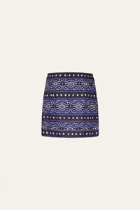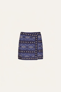 A wrap mini skirt cut in light poplin, in navy and ecru. Defined by its structured silhouette and a JO print, it’s designed for statement styling. Pair with the matching top for a coordinated look. Size and Fit: Low-rise, mini length. Please refer to our size chart for detailed guidance. Product Details: Closure: Wrap Around Composition: 100% Cotton Fabrication: Light Popling Color: Navy/Ecru Made in Colombia Dimensions: Length 15.35''