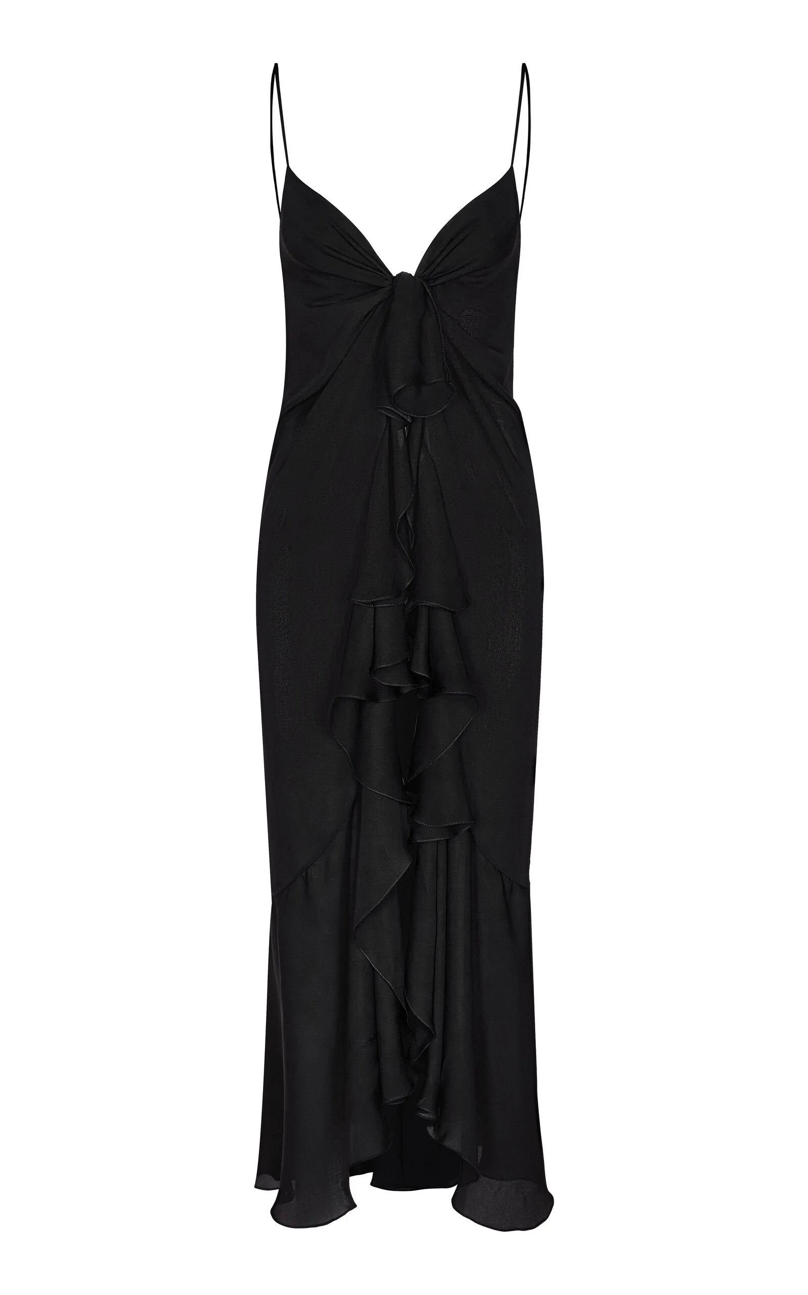 PRODUCT DETAILS - Cami straps, V-neck, tie front, cascading ruffle trim, long maxi length - Slip on - Unlined - Composition: 100% Silk - Color: black - Dry clean only - Spring/Summer '25