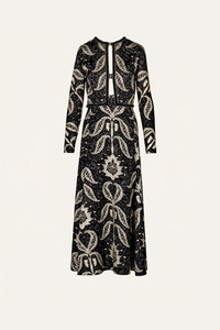 A printed jacquard dress with a cropped overlay, open slit front, and long sleeves. Designed with a flared skirt and contrast trim, it brings structure and dimension to the silhouette. Style with heels or boots for transitional evening looks. Size and Fit: True to size. Designed for a slim fit. Please refer to our size chart for detailed guidance. Product Details: Closure: Back Zipper Composition: 100% Viscose Fabrication: Printed Jacquard Color: Black/Ecru Made in Colombia Dimensions: Length 36.22''