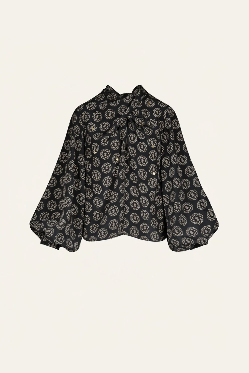A silk crepe de chine blouse with a self-tie neckline and voluminous sleeves that taper at the cuff. The relaxed shape can be worn tucked in or loose. Pair with the matching pants for a coordinated look or with denim for a laid-back take. Size and Fit: True to size. Designed for a relaxed fit. Please refer to our size chart for detailed guidance. Product Details: Closure: Tie At Back Composition: 100% Silk Fabrication: Washed Cdc Color: Black/Sand Made in Colombia