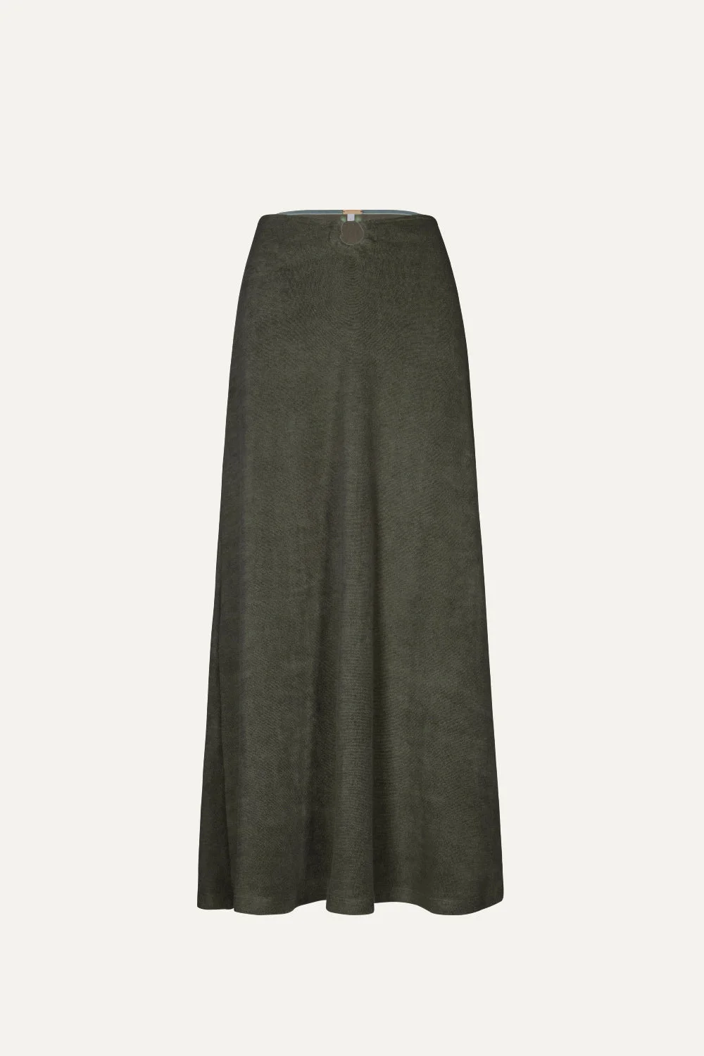 A signature Johanna Ortiz midi skirt with a sleek, flowing silhouette. Low-rise, A-line silhouette. Effortlessly pairs with matching one-piece swimsuits, bikini tops, and shirts for a total Johanna Ortiz resort look. Size and Fit: - Low-rise, A-line silhouette. - Please refer to our size chart for detailed guidance. Product Details: Closure: Slip On Composition: 100% Cotton Fabrication: Terry Color: Charros Green Made in Colombia Dimensions: Length 36.2''