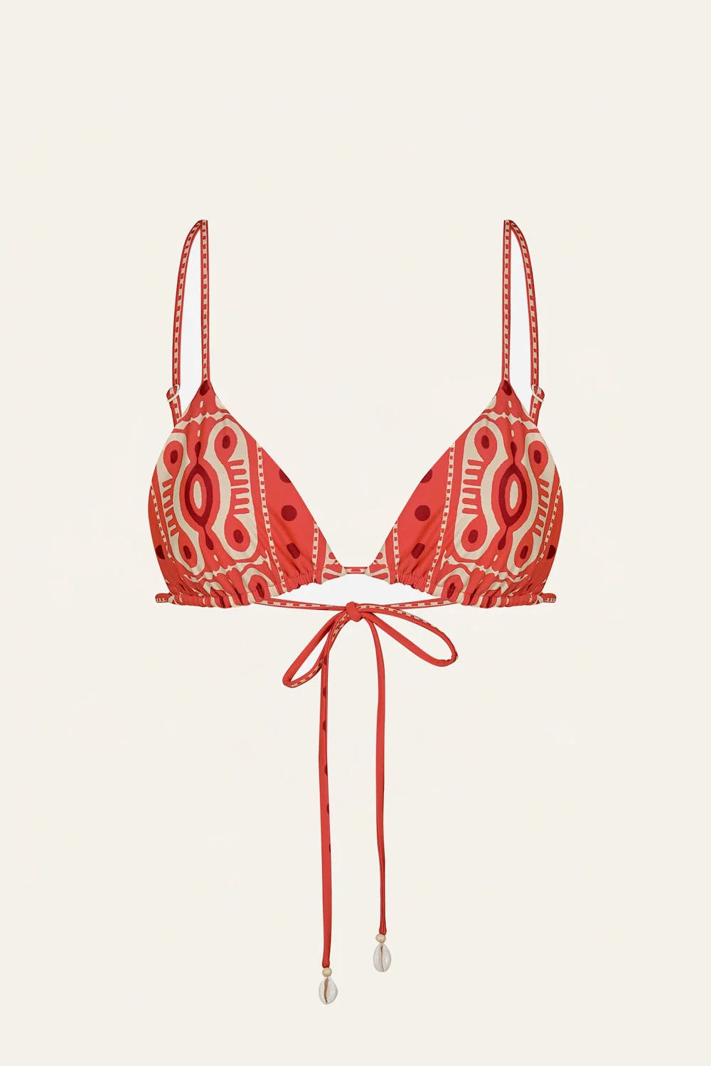 A timeless triangle bikini top in a JO print. Designed for a customizable fit with adjustable straps and finished with embroidered tassels for a signature touch. Pair with the matching bikini bottom or mix and match for a personalized look. Size and Fit: Runs small; consider sizing up for a more comfortable fit. Adjustable shoulder and back straps. Please refer to our size chart for detailed guidance. Product Details: Closure: Tie At Back Composition: 78% Polyamide, 22% Elastane Fabrication: Printed Lycra Color: Red/Ecru Made in Colombia