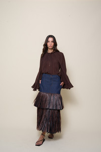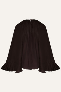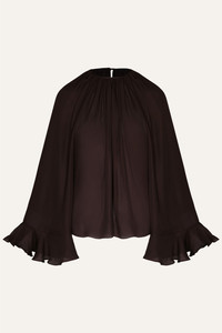 A loose-fit blouse crafted from silk double georgette, featuring a round neckline and long, flowing sleeves with delicate ruffled hems. This versatile piece transitions seamlessly from casual to formal settings. Size and Fit: True to size. Loose fit for a relaxed silhouette. Please refer to our size chart for detailed guidance. Product Details: Closure: Back Button Composition: 100% Silk Fabrication: Silk Double Georgette Color: Dark Chocolate Made in Colombia