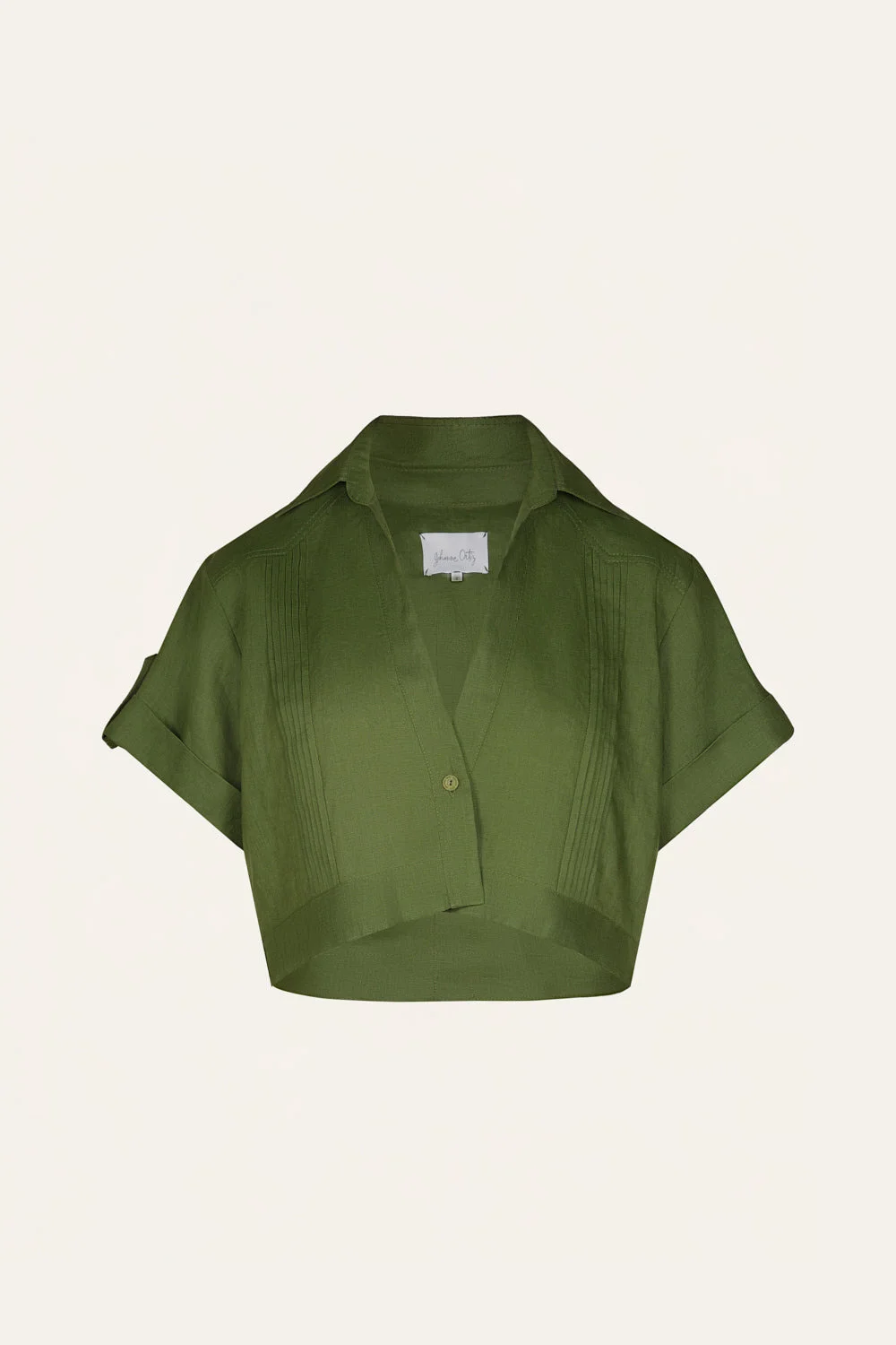 A cropped shirt cut in linen, in green. Defined by its sharp collar, single-button front, and boxy short sleeves. Style with the matching pant for a coordinated look. Size and Fit: True to size. Boxy fit. Please refer to our size chart for detailed guidance. Product Details: Closure: Front Button Composition: 100% Linen Fabrication: Linen Color: Green Made in Colombia