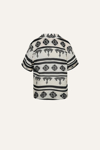 A relaxed-fit linen shirt featuring an artisanal print, perfect for effortless summer styling. Designed with a soft collar and short sleeves, it pairs seamlessly with the Roots Wrap Skirt for a coordinated look or can be styled with other pieces from the collection for versatile wear. Size and Fit: - Boxy fit. - Please refer to our size chart for detailed guidance. Product Details: Closure: Front Buttons Composition: 100% Linen Fabrication: Light Linen Color: Ecru/Black Made in Colombia
