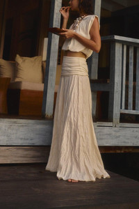 DETAILS AND INSIGHT Johanna Ortiz light and sound ankle skirt. 75% ORGANIC LINEN 16% POLYESTER 9% COTTON DRY CLEAN ANY SOLVENT EXCEPT TETRACHLORETHYLENE Made in Colombia Ships by June 14 Style PT02146-ECRU