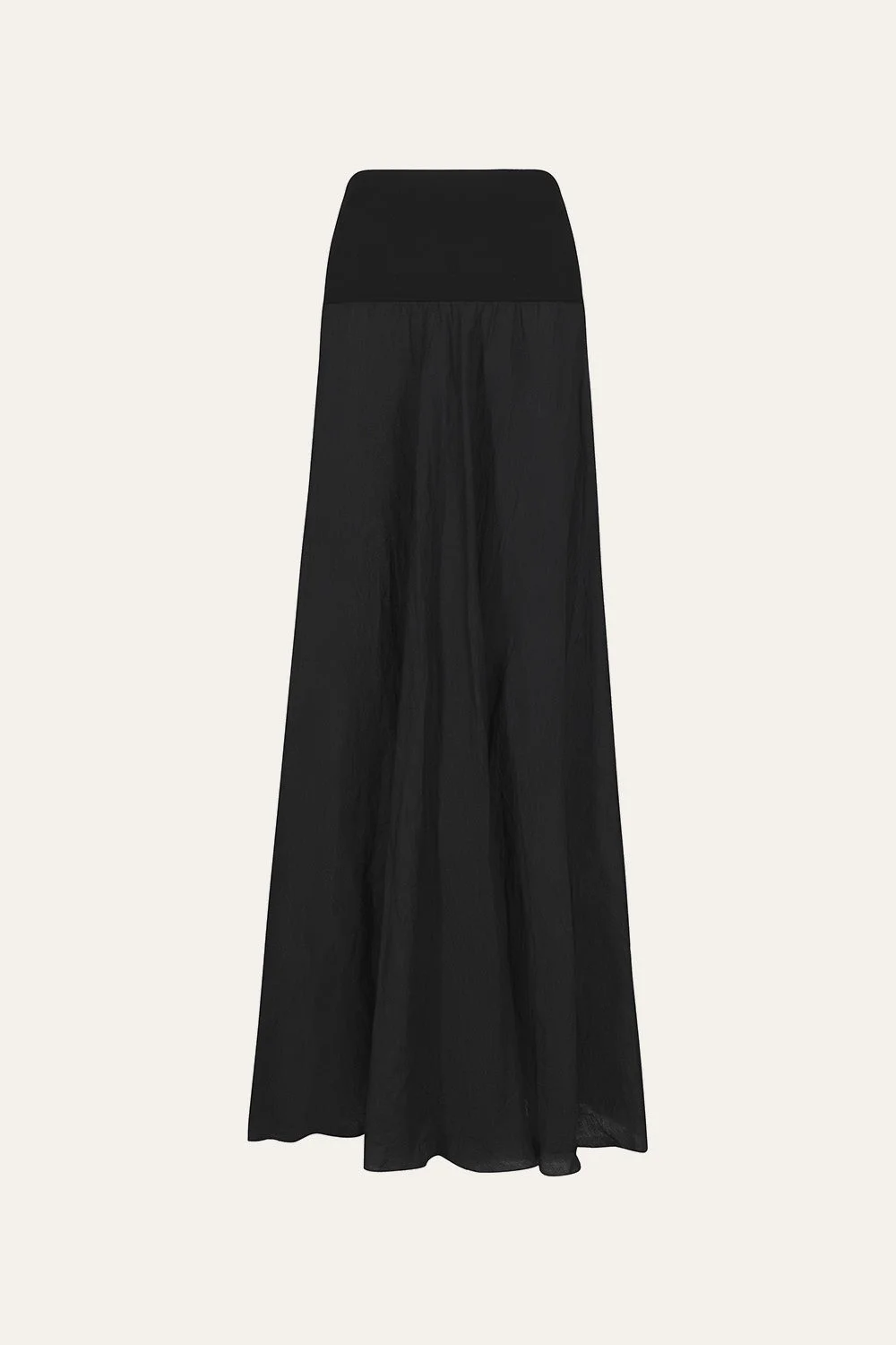 A classic Johanna Ortiz piece. Designed for versatile styling, it can be worn as an ankle-length skirt or dress, offering effortless elegance with its ribbed texture and soft linen blend. Size and Fit: - True to size. - High-rise fit when worn as a skirt. - Please refer to our size chart for detailed guidance. Product Details: Closure: Slip On Composition: 75% Organic Linen, 16% Polyester, 9% Cotton Fabrication: Rib Linen Color: Black Made in Colombia Dimensions: Length 40.2''