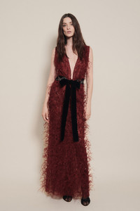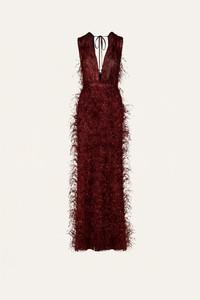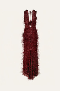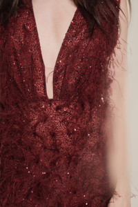 Embroidered throughout and finished with feather accents, this piece brings texture and movement to evening dressing. Style with high heels and the Celestial Feminine Belt for a complete event look. Size and Fit: True to size. Designed for a slim fit. Please refer to our size chart for detailed guidance. Product Details: Closure: Back Zipper Composition: 100% Polyamide Fabrication: Feathers Embroidered Color: Wine Made in India Dimensions: Length 45.28''.