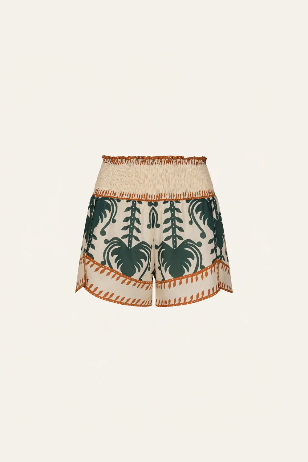 High-rise shorts cut in light poplin, in ecru and green with a JO print. Defined by a wide smocked waistband and curved hem finished with contrast trim. Style with the matching top for a coordinated look. Size and Fit: True to size. High-rise fit. Please refer to our size chart for detailed guidance. Product Details: Closure: Slip On Composition: 100% Cotton Fabrication: Light Popling Color: Ecru/Green Made in Colombia
