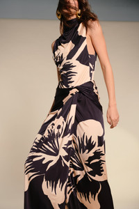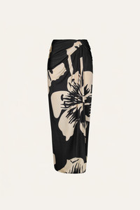 Draped skirt with a twisted waistband and gathered front that adds soft structure and movement. The bold floral motif brings contrast and visual rhythm. Wear it with the matching top for a full statement look, or pair it with a monochrome top for a more relaxed take. Size and Fit: - True to size. - Mid-rise. - Please refer to our size chart for detailed guidance. Product Details: Closure: Slip On Composition: 96% Viscose, 4% Elastane Fabrication: Shiny Jersey Color: Black/Ecru Made in Colombia Dimensions: Length 37.4''