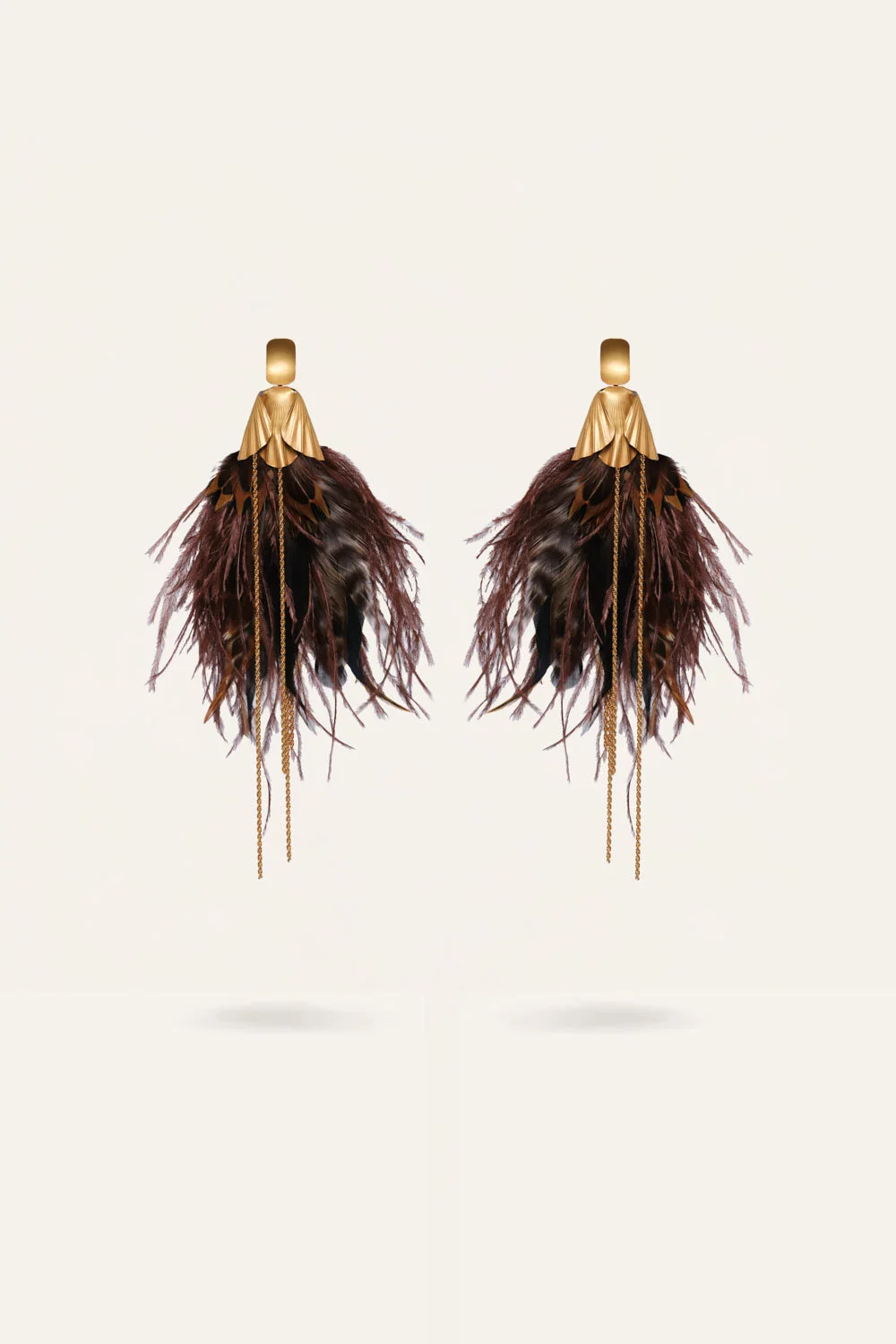 With refined floral shapes and luminous accents, this pair offers a subtle touch of drama. Wear them to bring movement and light to monochrome looks or flowing silhouettes. Product Details: Closure: Post Fastening For Pierced Ears Composition: 60% Metal Brass Golding, 40% Feathers Fabrication: Metal Brass Golding And Feathers Color: Dark Chocolate/Gold Made in Colombia Dimensions: Width 2.76'', Height 8.66''