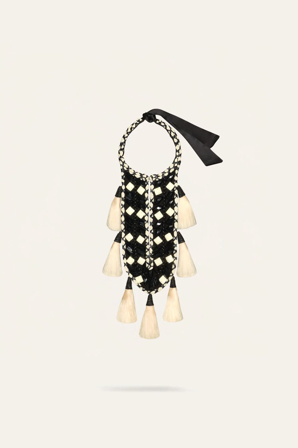 Adorned with a mix of materials and techniques, this necklace boasts an intricate design, blending artistry with cultural inspiration for a unique and eye-catching accessory. Product Details: Closure: Ribbon Tie - Wrap Around Neck Composition: 50% Glass, 25% Goat Leather, 15% Silk, 10% Viscose Fabrication: Glass, Goat Leather, Silk & Viscose Necklace Color: Antique Ecru/Iconic Black Made in Colombia Dimensions: Length Around Neck: 13.78'' (Adjustable)