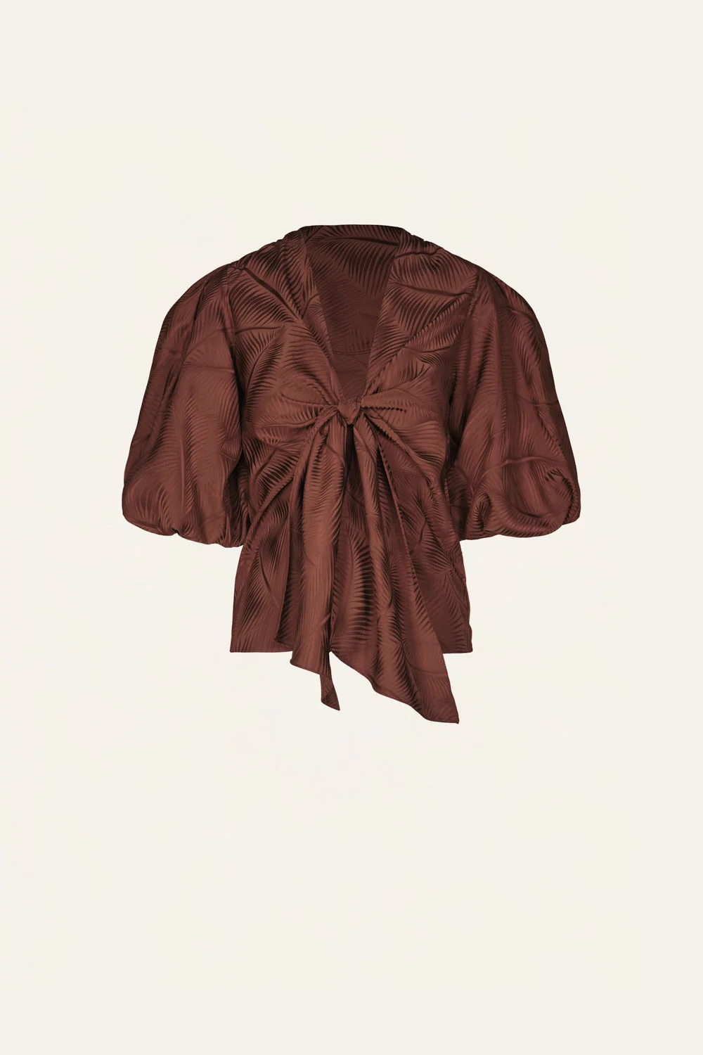Palmnimal jacquard top with voluminous short sleeves and a deep V-neckline that ties at the waist. Designed to be worn with the matching skirt for a coordinated look, or styled with denim for contrast. Size and Fit: - True to size. - Boxy fit. - Please refer to our size chart for detailed guidance. Product Details: Closure: Tie At Front Composition: 100% Viscose Fabrication: Palmnimal Jacquard Color: Chocolate Made in Colombia