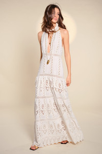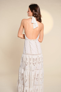 Sleeveless embroidered voile maxi dress with halter neckline and tiered construction. Features a deep front slit and open back. Style it with bold jewelry and sandals for warm-weather occasions. Size and Fit: - True to size. - Please refer to our size chart for detailed guidance. Product Details: Closure: Back Zipper Composition: 100% Polyester Fabrication: Embroidered Voile Color: Ecru Made in Colombia Dimensions: Length 44.09''