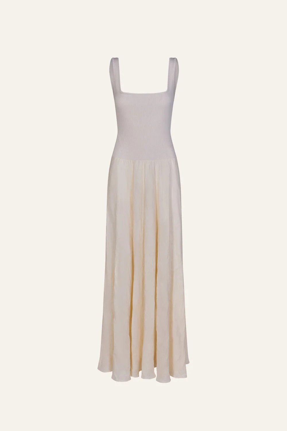 A maxi-length dress crafted from a soft linen-cotton blend with a ribbed texture. Featuring a squared neckline and a flowing silhouette, it’s designed for effortless movement and versatile styling. Size and Fit: - True to size. - Please refer to our size chart for detailed guidance. Product Details: Closure: Slip On Composition: 75% Organic Linen, 16% Polyester, 9% Cotton Fabrication: Rib Linen Color: Ecru Made in Colombia Dimensions: Length 40.6''