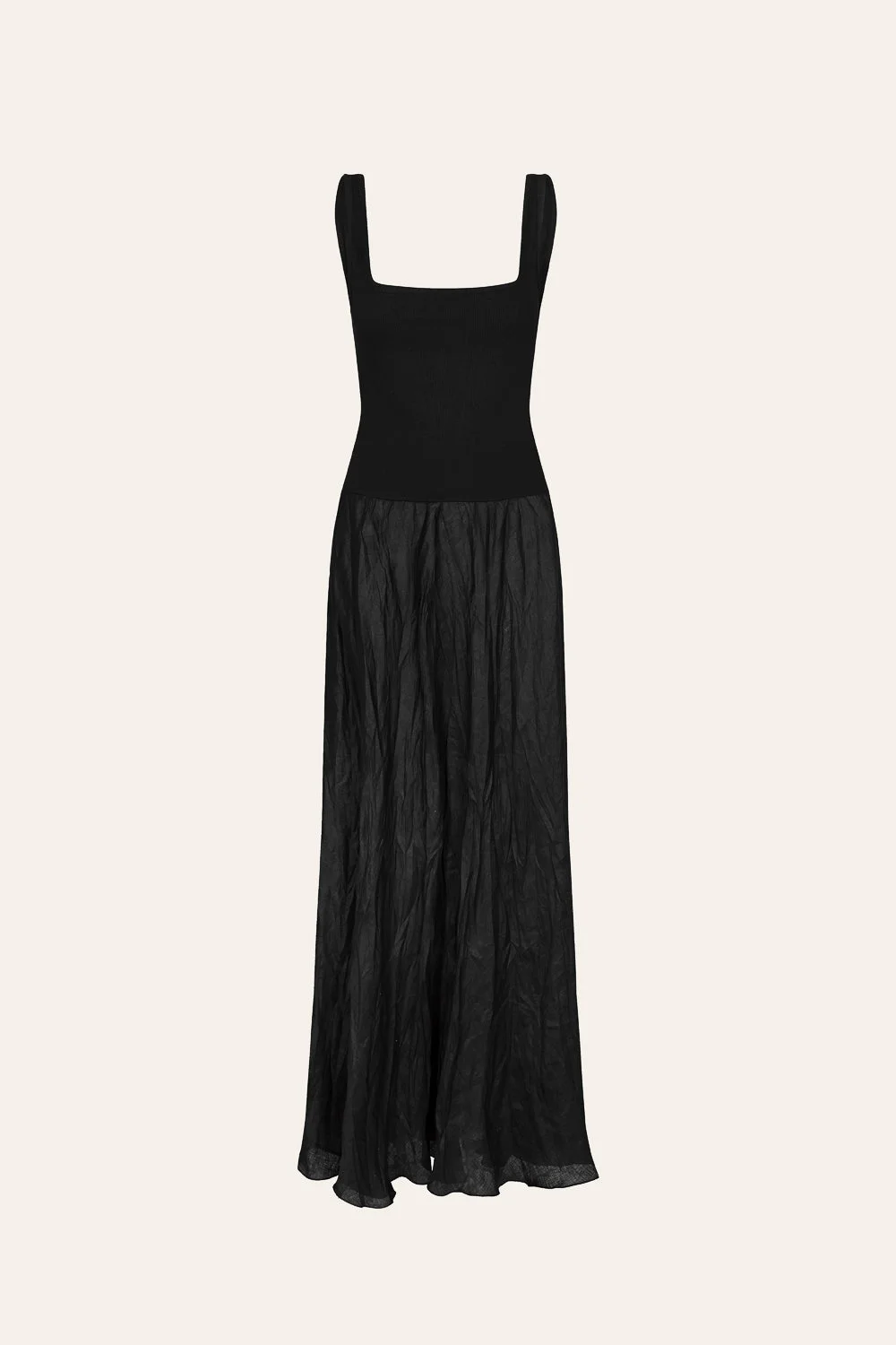 A maxi-length dress crafted from a soft linen-cotton blend with a ribbed texture. Featuring a squared neckline and a flowing silhouette, it’s designed for effortless movement and versatile styling. Size and Fit: - True to size. - Please refer to our size chart for detailed guidance. Product Details: Closure: Slip On Composition: 75% Organic Linen, 16% Polyester, 9% Cotton Fabrication: Rib Linen Color: Black Made in Colombia Dimensions: Length 40.6''