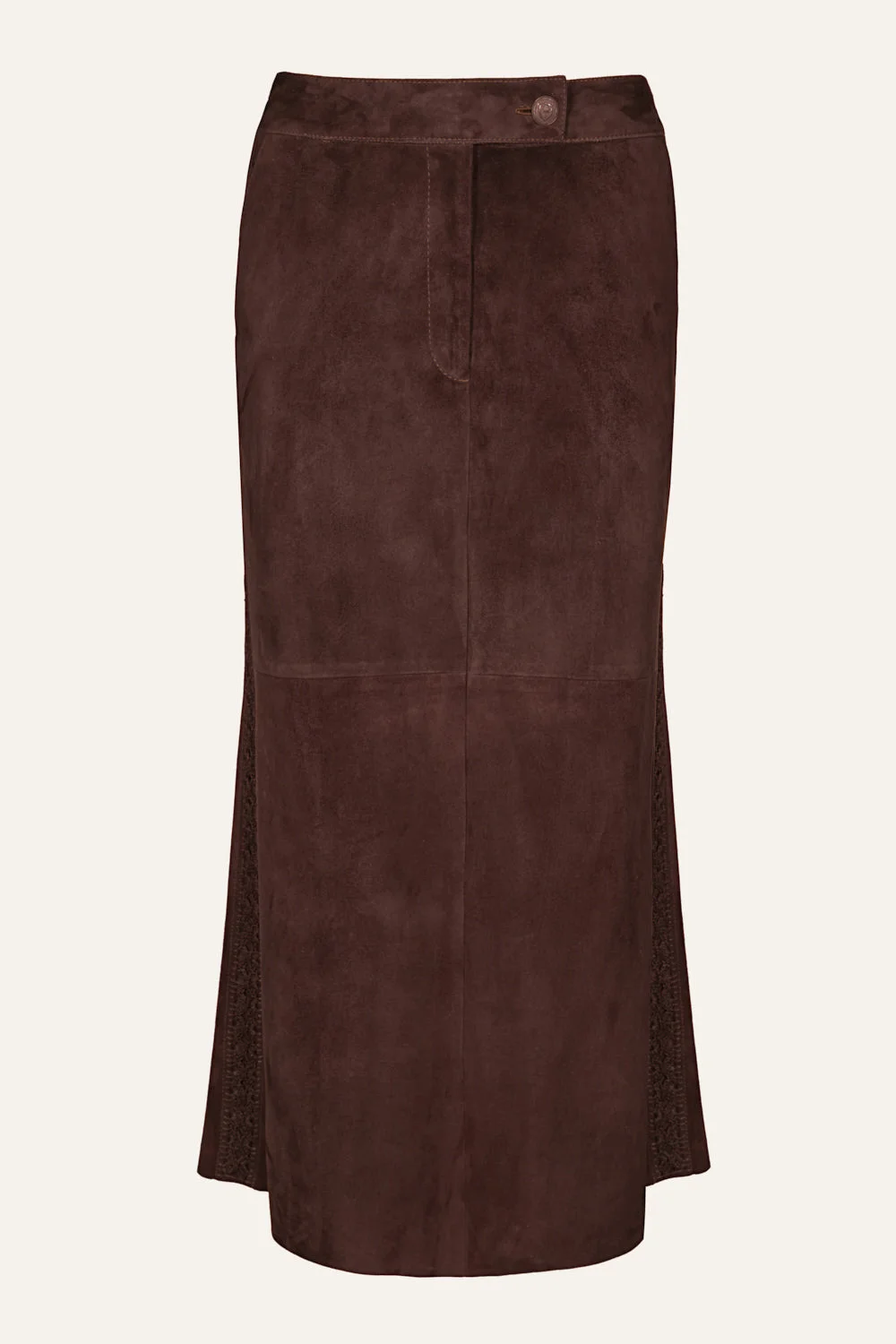 This mid-waist leather suede skirt features a smooth, structured silhouette with subtle paneling details that enhance its flared shape. The fit is intentionally relaxed, running slightly larger to offer a more comfortable, laid-back look. Its sleek finish pairs well with both casual and elegant tops, making it a versatile piece for various occasions. Size and Fit: Designed for a slim fit. Please consult our size chart for reference. Product Details: Composition: 100% Cow Leather Fabrication: Leather Color: Chocolate Made in Colombia