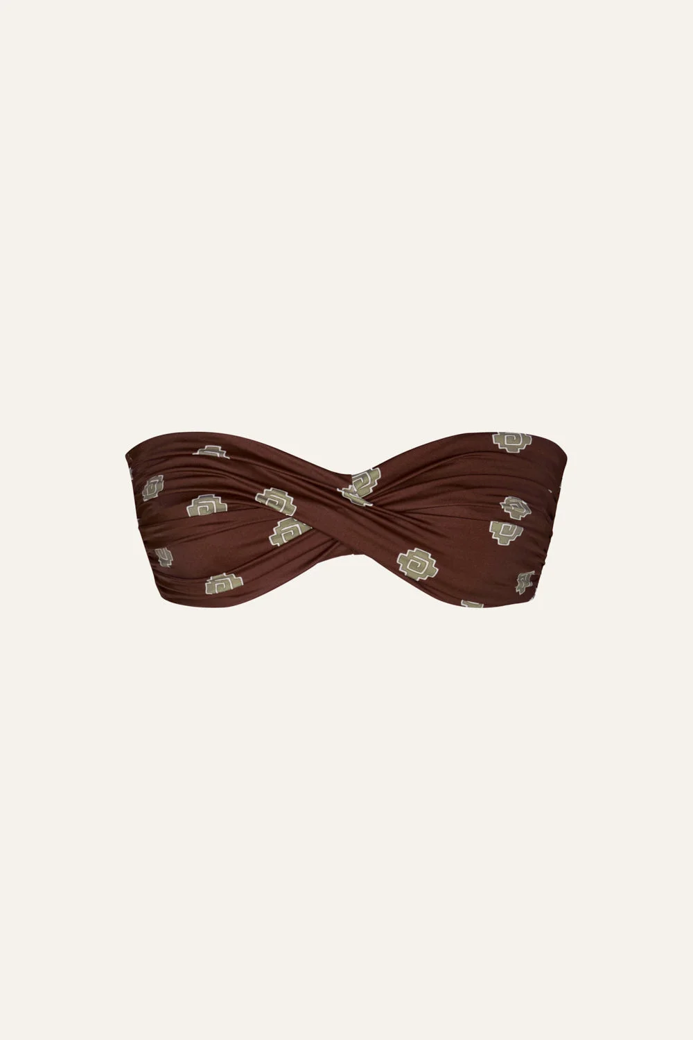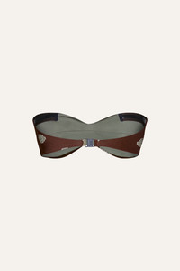 A strapless bikini top in printed lycra with ruched detailing. Designed for a sleek fit, it pairs effortlessly with the matching bikini bottom or mix-and-match styles from the collection. Size and Fit: - Runs small on the bust based on customer feedback. - Please refer to our size chart for detailed guidance. Product Details: Closure: Tie Fastening Composition: 78% Recycled Polyamide, 22% Elastane Fabrication: Printed Lycra Color: Dark Chocolate/Light Green Made in Colombia