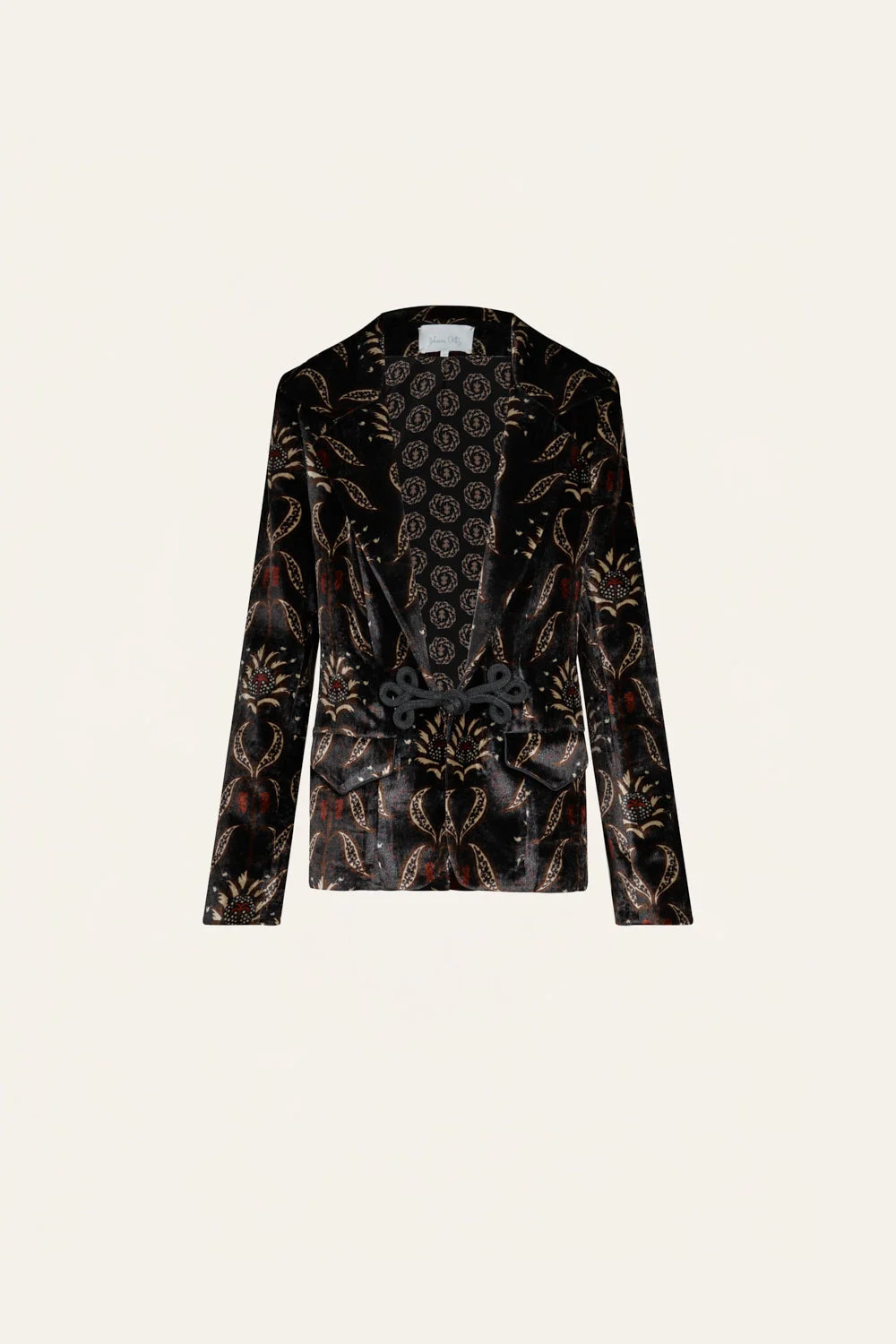 A tailored velvet jacket with peak lapels and a structured shoulder, shaped by a tonal knotted cord closure at the waist. The intricate jacquard artwork brings depth to the surface, lending character and dimension. Pair it with the coordinating trousers or layer over a minimal base to let the pattern lead. Size and Fit: True to size. Please refer to our size chart for detailed guidance. Product Details: Closure: Front Buttons Composition: 82% Viscose, 18% Silk Fabrication: Velvet Color: Black/Sand/Red Made in Colombia
