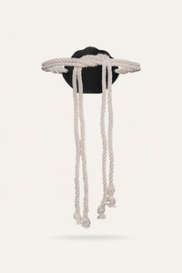 A belt crafted from leather and cotton, featuring a seashell-inspired centerpiece with braided ties. Its artisanal design makes it a statement accessory, perfect for layering over dresses, kaftans, and pareos. Product Details: Hand Embroidered Closure: Wrap Around Composition: 50% Cow Leather, 30% Viscose, 20% Cotton Fabrication: Leather, Viscosa And Cotton Belt Color: Ecru/Black Made in Colombia Dimensions: Length 4.33'', Width 5.51'', Total Length: 33.46''