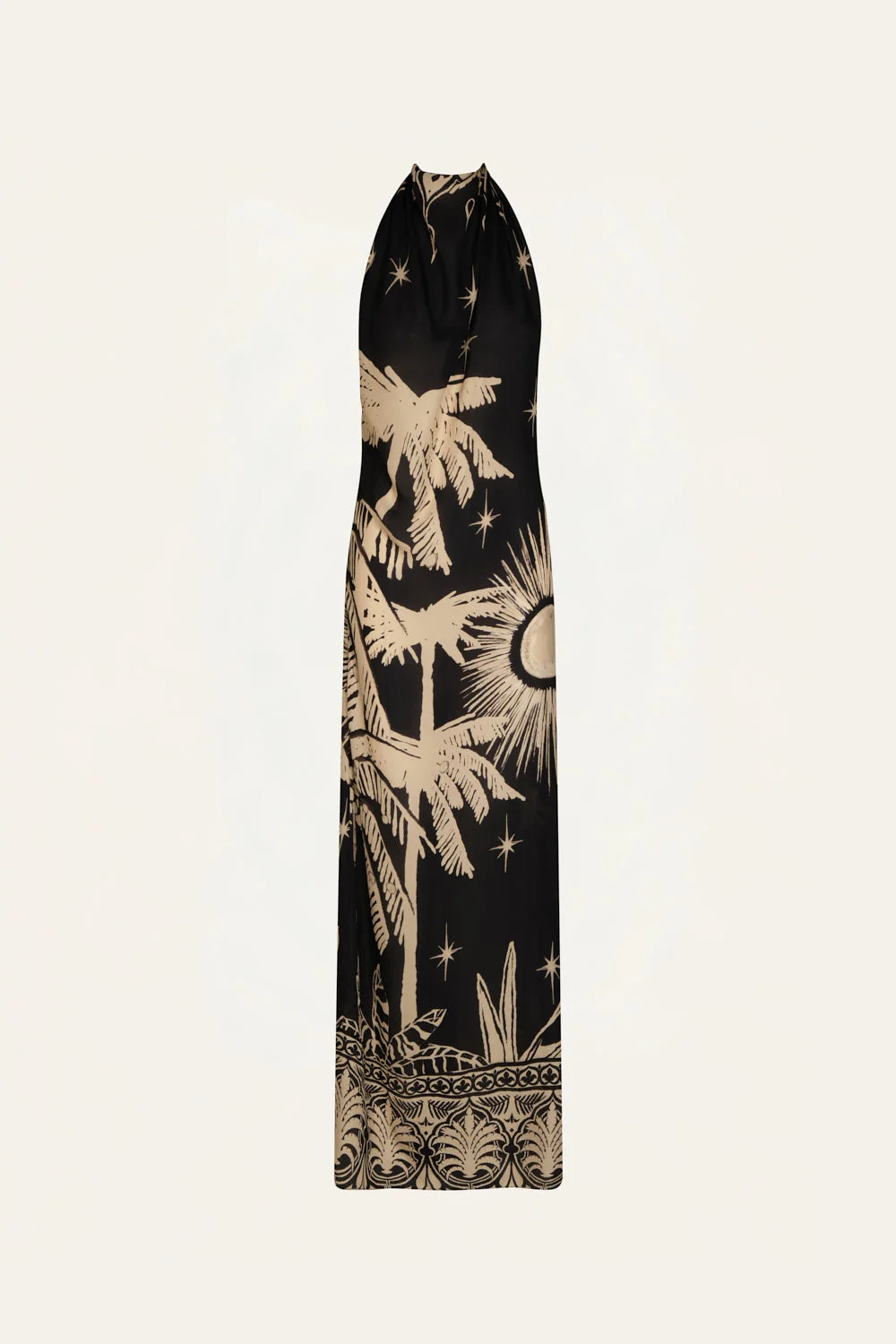 A fluid maxi dress crafted in pure silk and printed with a signature Johanna Ortiz palm landscape. Its halter neckline and open back lend an effortless sophistication, ideal for warm-weather soirees, sunset gatherings, or destination events. Size and Fit: Flowy fit. Maxi length. Please refer to our size chart for detailed guidance. Product Details: Closure: Tie At Back Composition: 100% Silk Fabrication: Silk Double Georgette Color: Black/Ecru Made in Colombia Dimensions: Length 44.09''