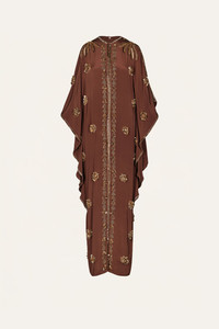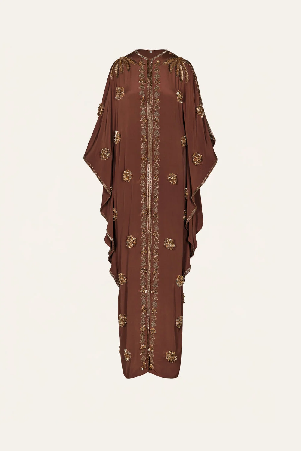 Emerging from dusk, she is a radiant vision—mysterious, elegant, and untamed. CANDELARIA transcends time, weaving magic and fortune into luminous textures. Each piece invites self-discovery, where elegance and mystery intertwine. Product Details: Closure: Slip On Composition: 100% Silk Fabrication: Silk Cdc Color: Chocolate Made in India Dimensions: Length 44.09''