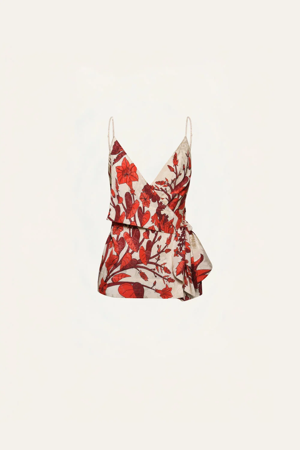 Size and Fit: - True to size. Please refer to our size chart for detailed guidance. Product Details: Closure: Wrap Around Composition: 100% Viscose Fabrication: Printed Jacquard Color: Ecru/Red Made in Colombia