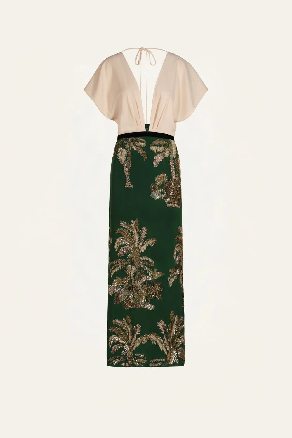 A silk dress showcasing intricate embroidery inspired by Johanna Ortiz’s tropical landscapes. Designed with a plunging neckline and contrast embroidered edges, it captures effortless sophistication. Perfect for evening occasions or elegant gatherings. Size and Fit: True to size. Maxi length. Please refer to our size chart for detailed guidance. Product Details: Closure: Tie At Back And Back Zipper Composition: 70% Silk, 30%Polyester Fabrication: Silk Cdc Color: Ecru/Green Made in India Dimensions: Length 37.40''